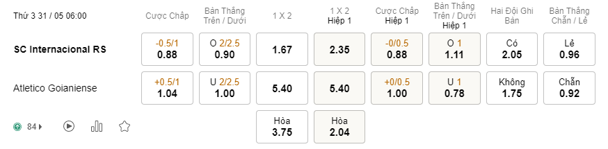 Soi kèo Châu Á Internacional vs Atletico GO: 0.88*0.5/1*1.04