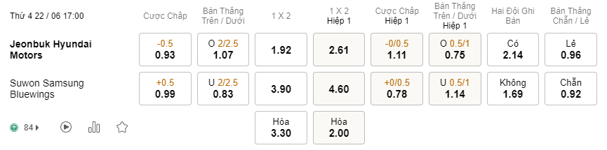 Một cặp đấu thường khan hiếm bàn thắng và lẽ dĩ nhiên chúng thường tới khá muộn ở hiệp 2. Cụ thể, 3 trận đấu gần nhất Jeonbuk đối đầu với Suwon Bluewings thì chỉ có duy nhất 1 trận chứng kiến bàn thắng tới trong hiệp 1. Vì vậy khả năng cao, 45 phút đầu tiên của trận đấu này sẽ khép lại mà không có bàn thắng nào được ghi.