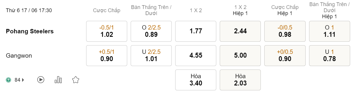 Soi kèo hiệp 1 Pohang Steelers vs Gangwon FC: 0.98*0/0.5*0.90