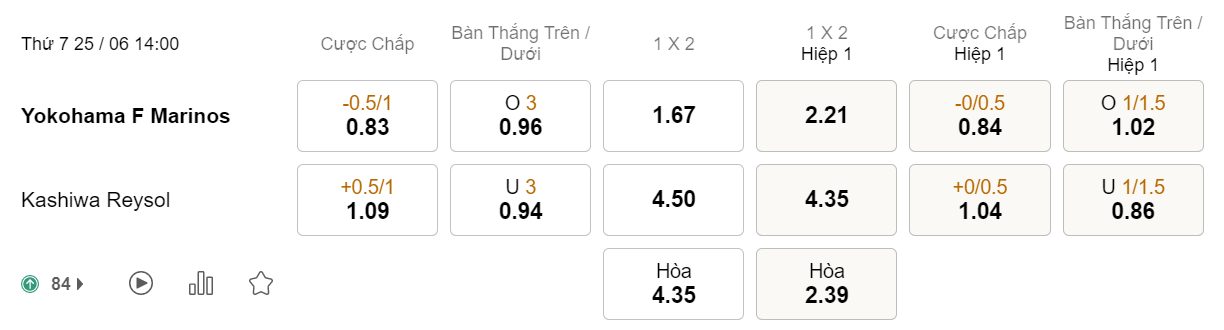 Soi kèo hiệp 1 Yokohama Marinos vs Kashiwa Reysol: 0.84*0/0.5*1.04